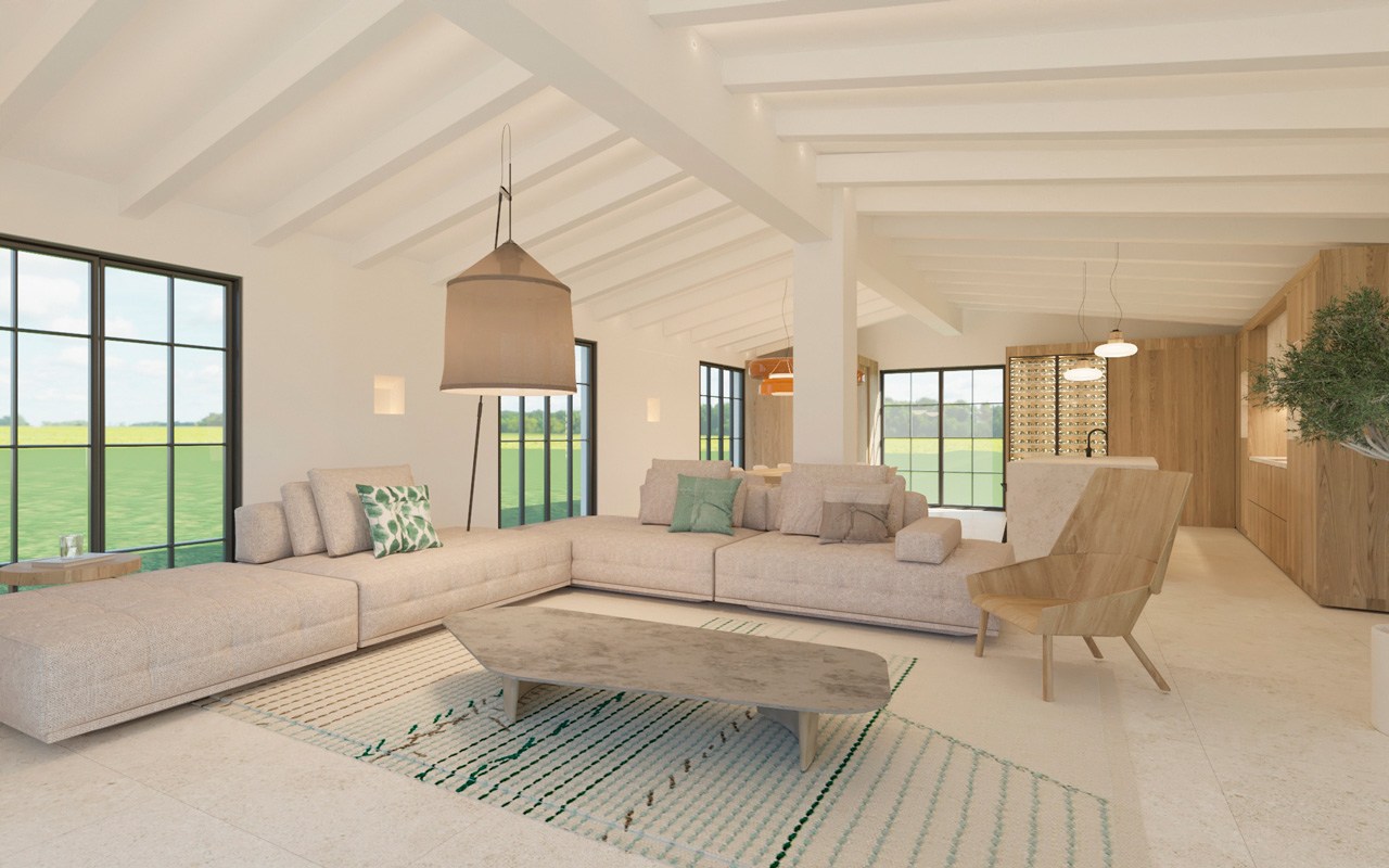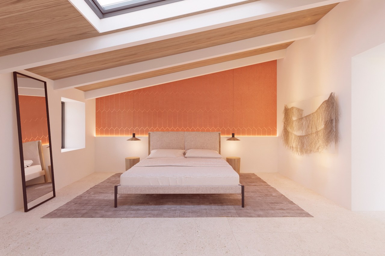 Im Obergeschoss finden wir die Suite mit privater Terrasse und ein Schlafzimmer mit Ankleideraum und Badezimmer.