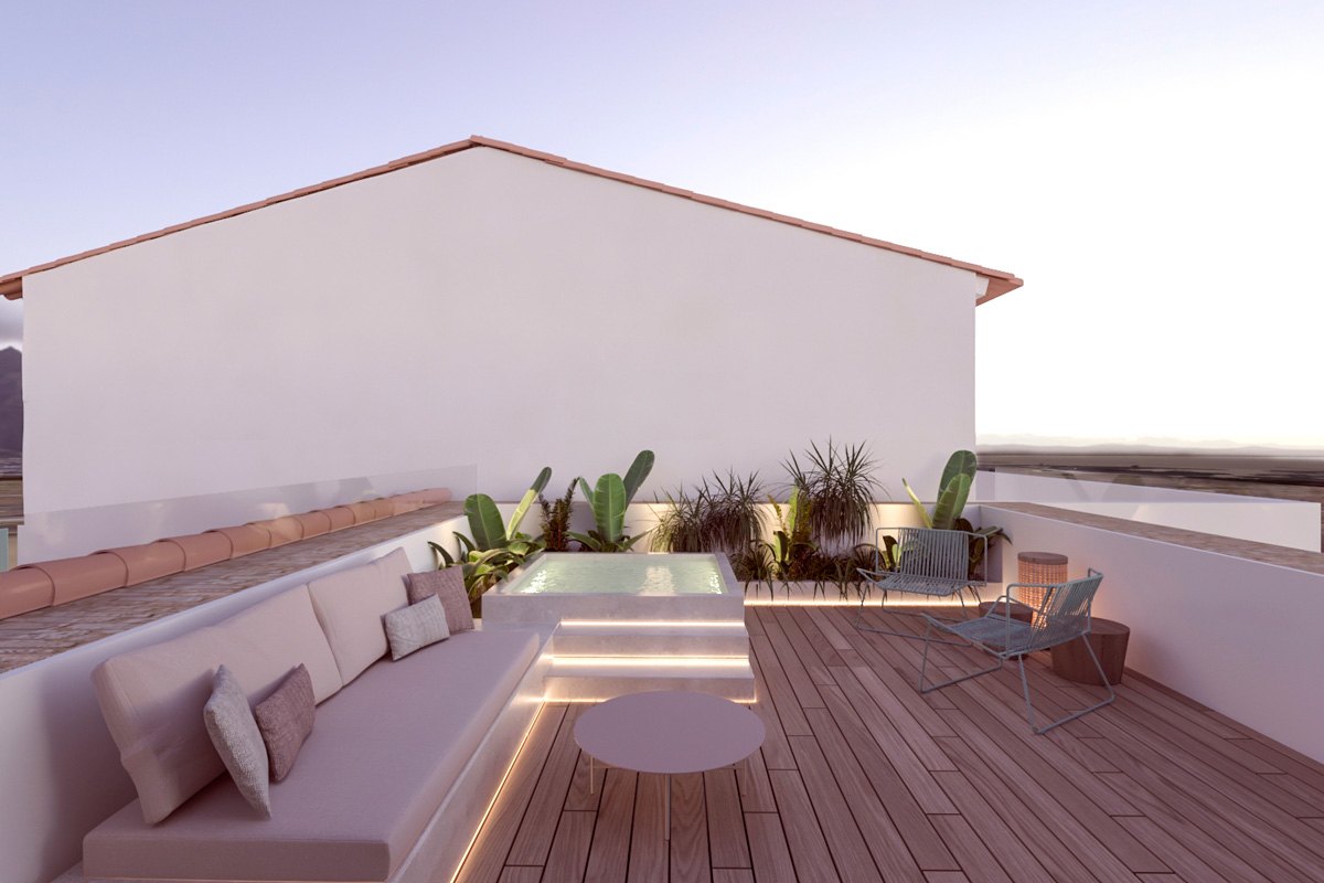 Der Zugang zu den oberen Geschossen kann über die Wendeltreppe genauso wie über den Aufzug erfolgen. Im ersten Stock befinden sich 2 Schlafzimmer, beide mit Bad En Suite, sowie das Hauptschlafzimmer und eine Terrasse. Im Obergeschoss befindet sich die Tachterrasse mit 50 qm inklusive Jacuzzi und Chill-Out-Zone.
