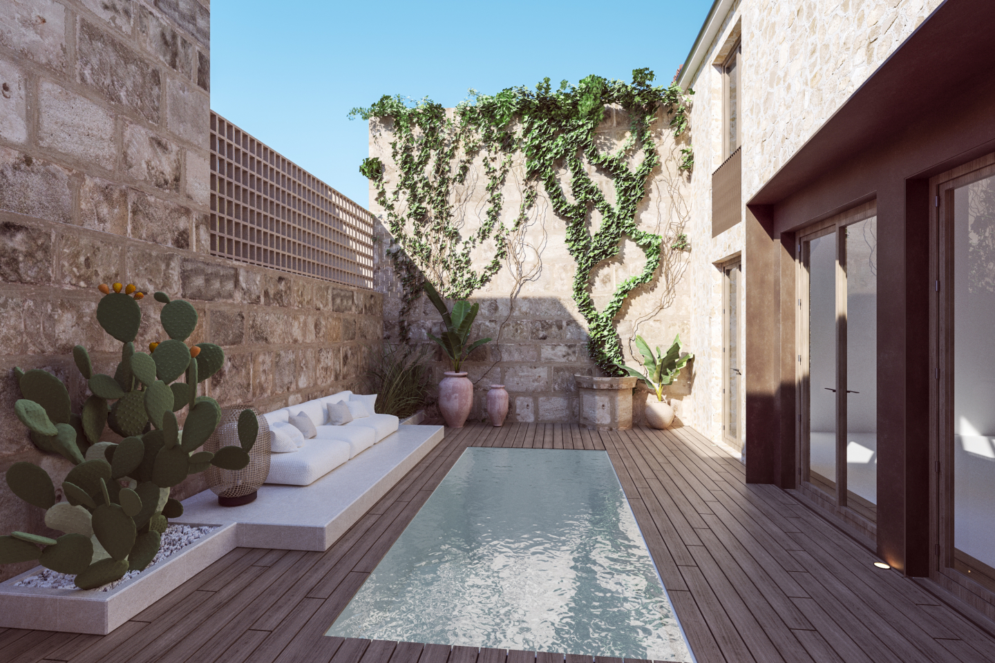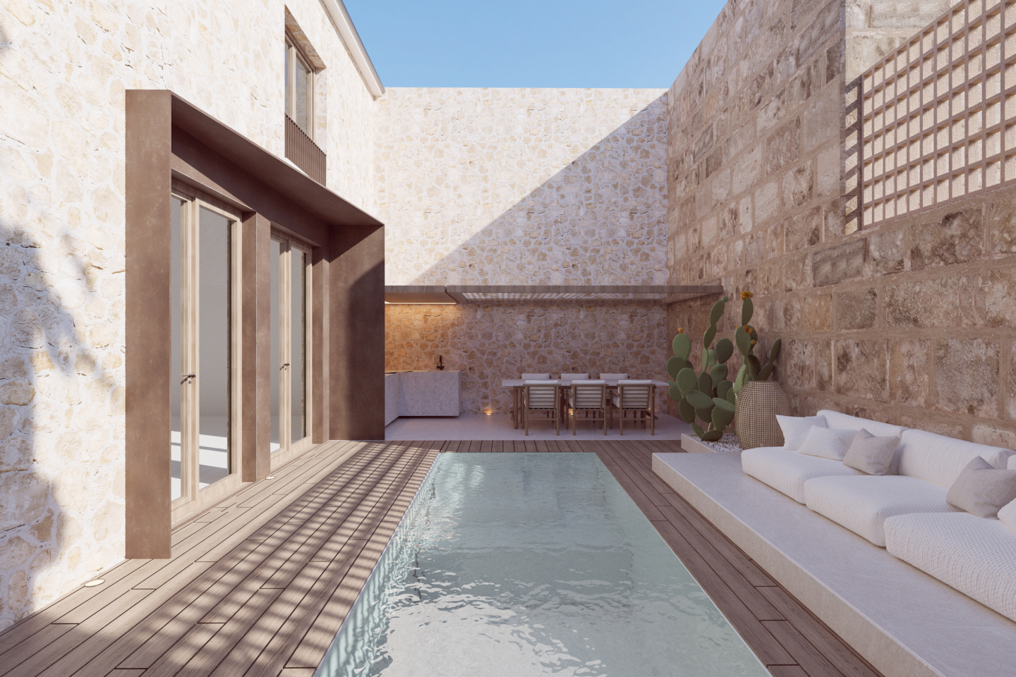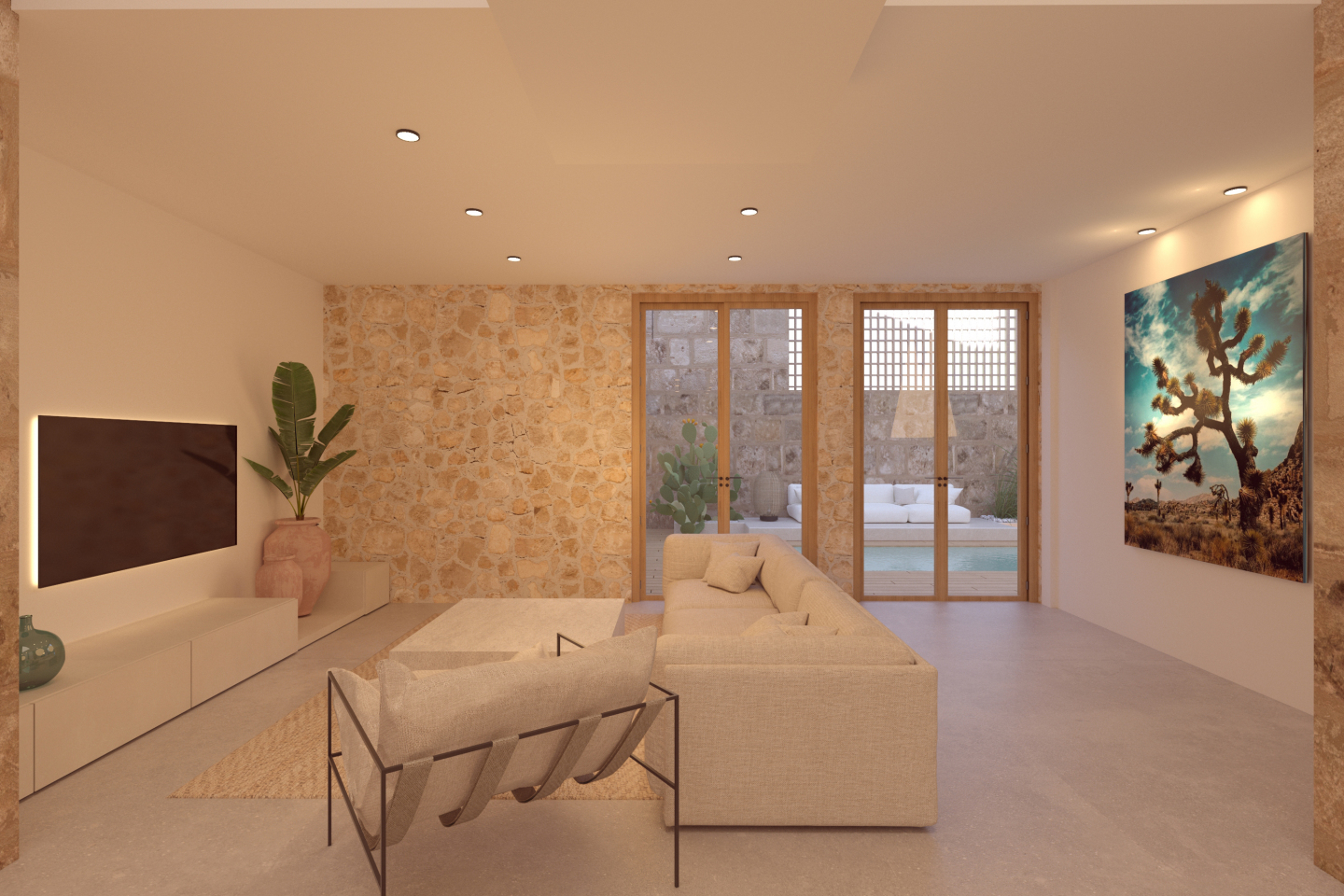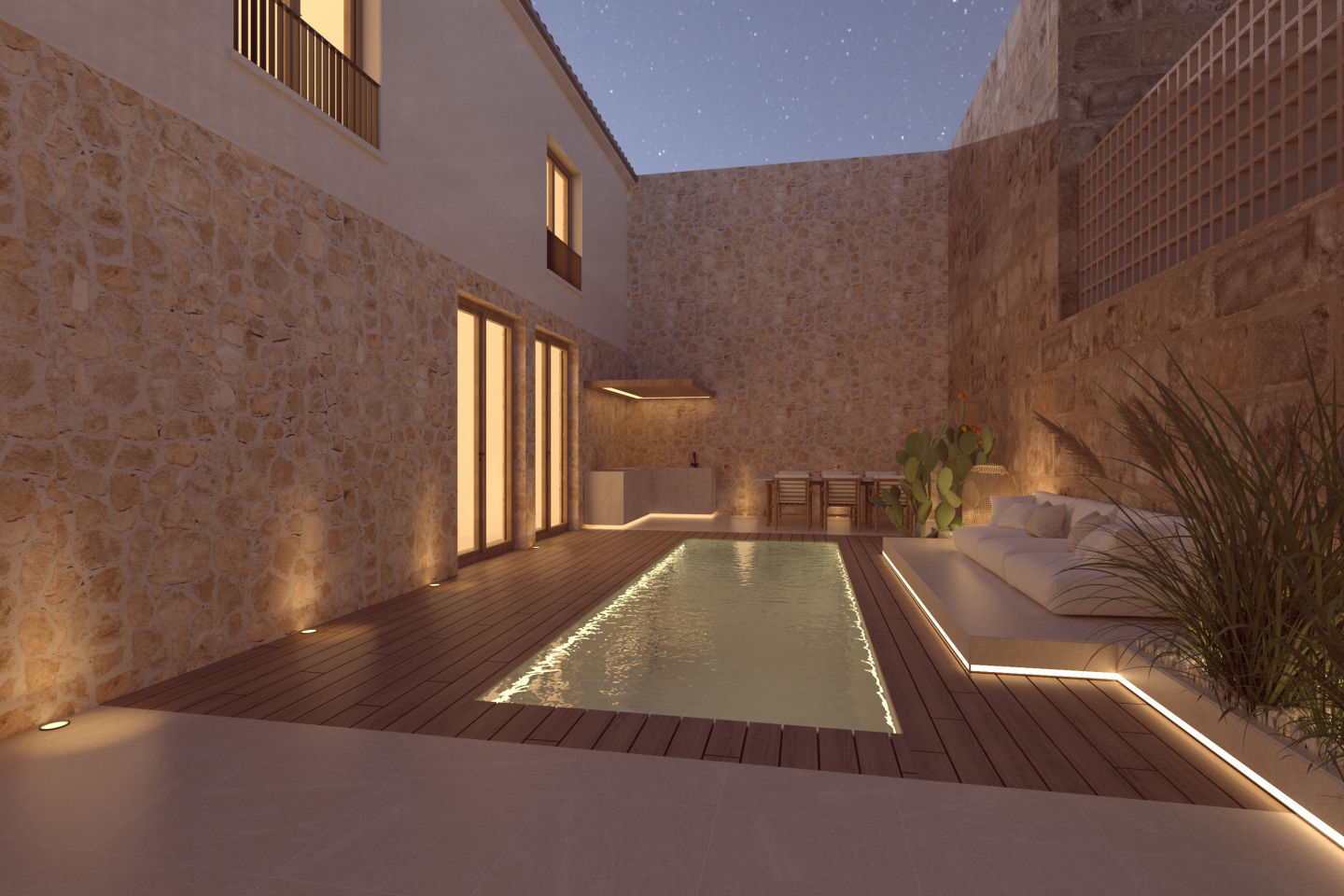 Tres habitacions, tres banys i una estupenda piscina amb una sofisticada zona exterior, amb zona de menjador i zona de descans. Cuina de disseny d’alta qualitat, composta per zona baixa de treball, torres per frigorífic, forn i microones, rebost extraïble i gran illa central. Llar de foc feta i dissenyada a mida amb base d’obra.