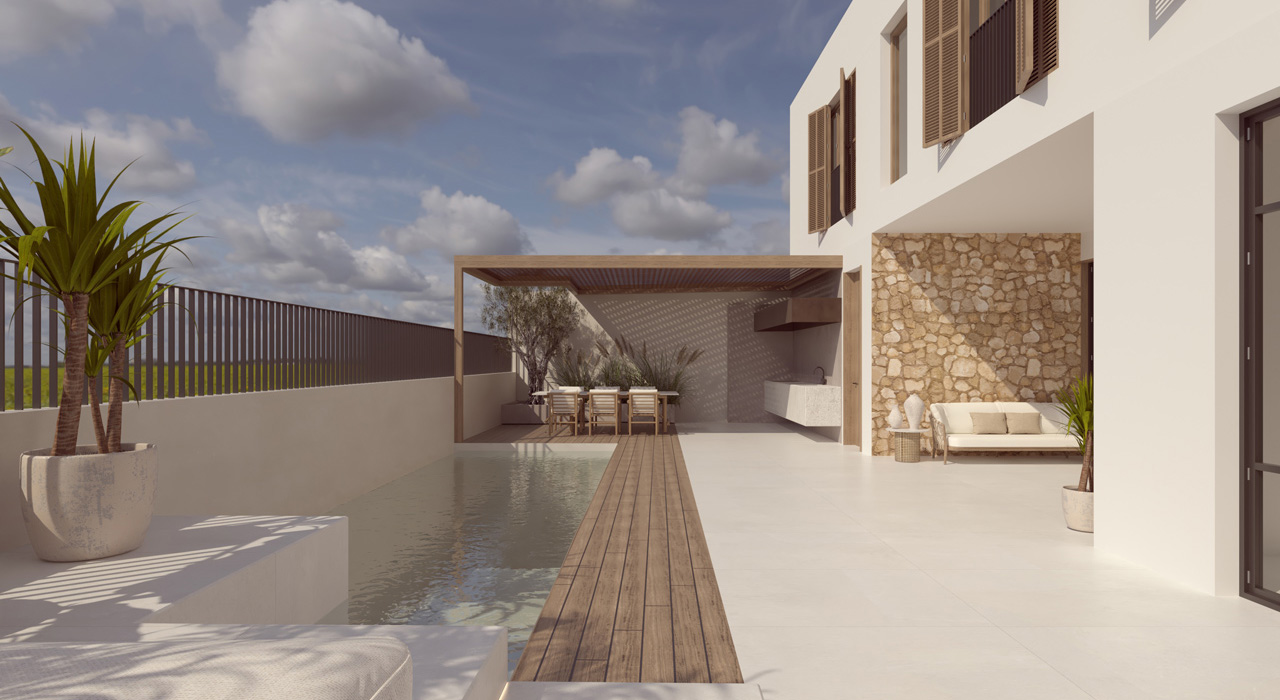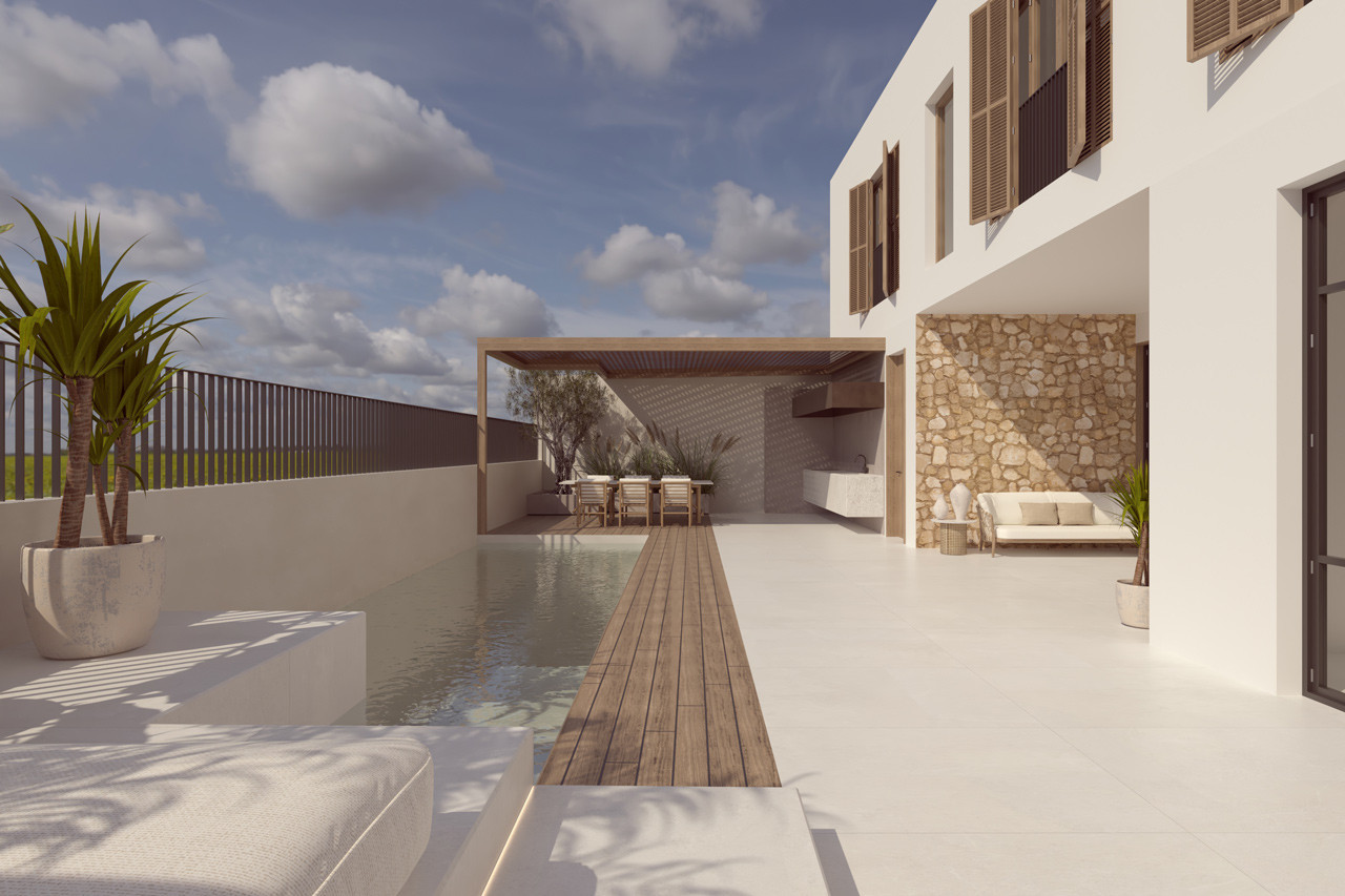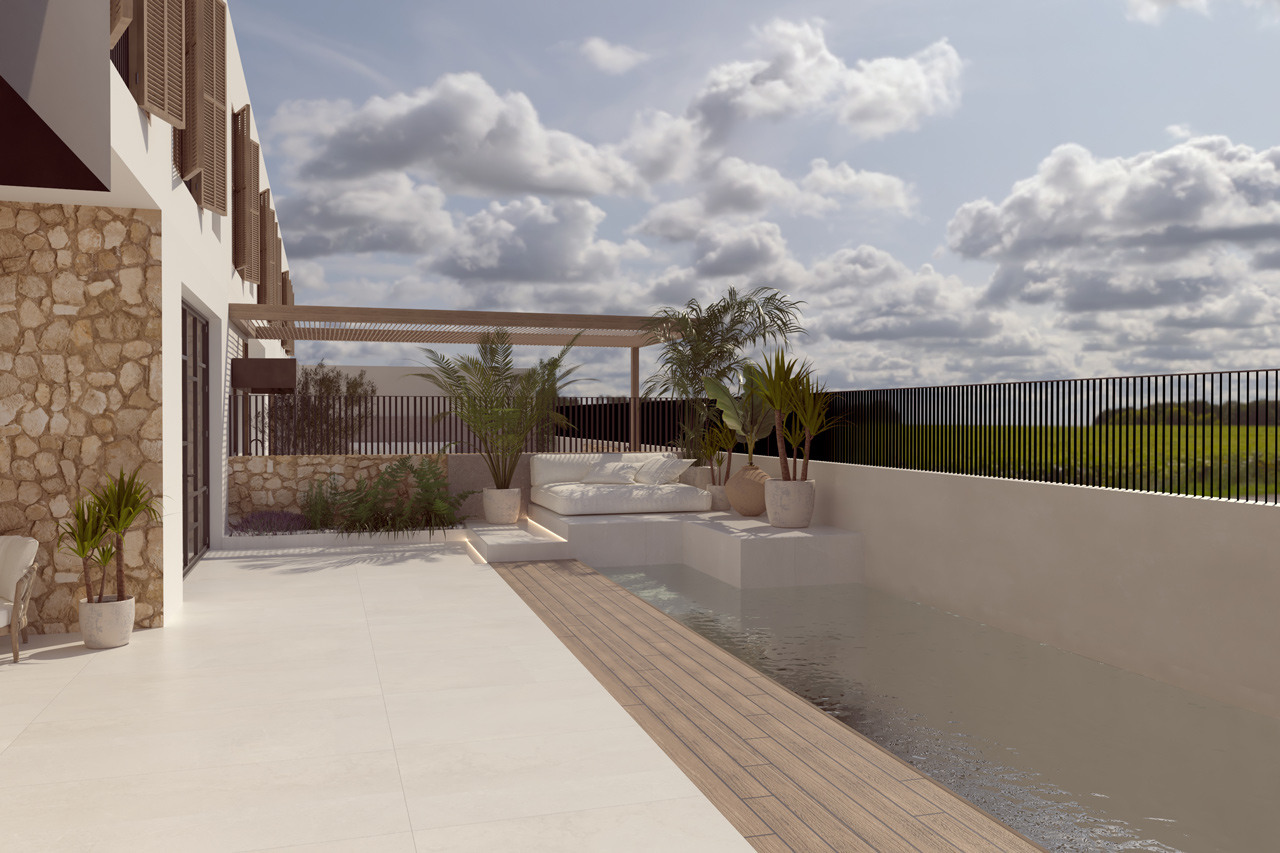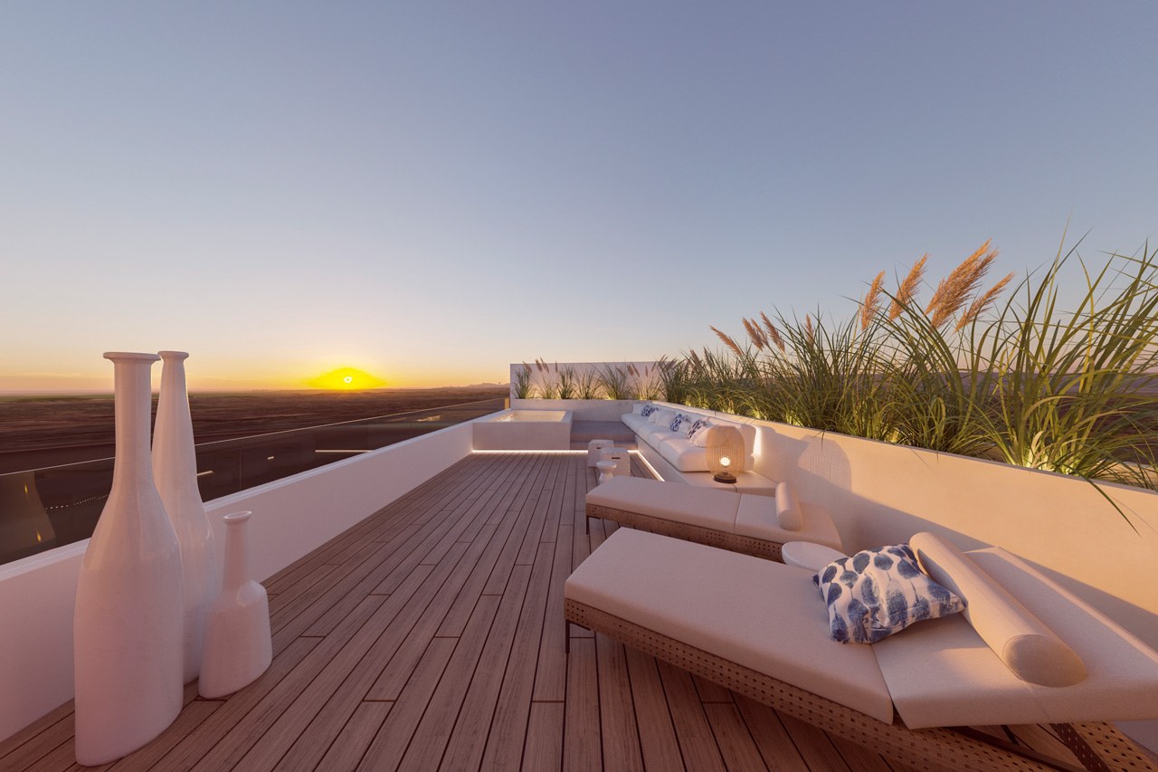 Zona exterior de 122 m2 amb piscina climatitzada d’aigua salada i terres de fusta flotant, així com a zona de chill out de maó i cuina exterior. Terrassa a l’àtic amb vistes clares, moblat i amb terres de fusta flotant.